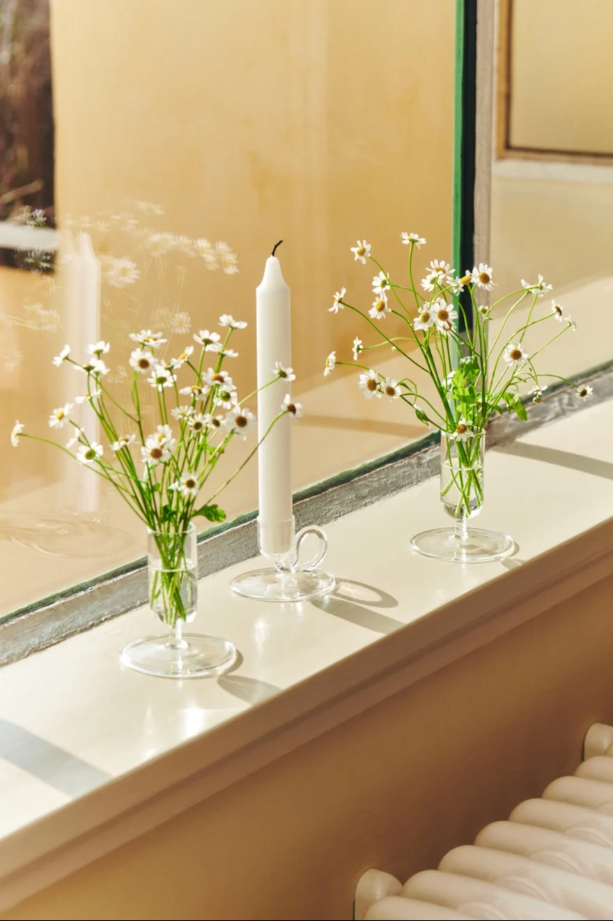 Skapa vackra blickfång i ditt fönster genom att inreda din fönsterbräda med detaljer i olika höjder, stilleben och gröna växter. Här har Hannes inrett fönsterbrädan med en bordslampa från ferm LIVING och Calore ljuslyktor från Byon.