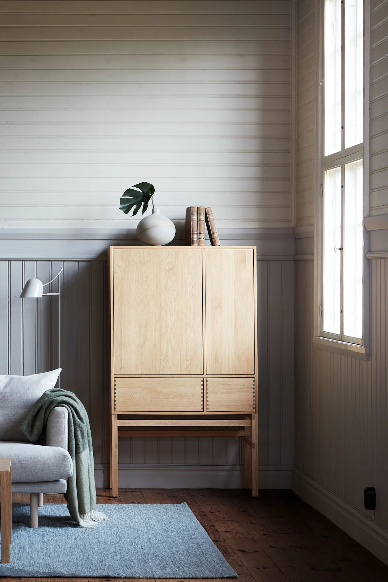Möbler och inredningsdetaljer är tillverkade i högkvalitativa naturmaterial där trä är nyckelmaterialet som sedan kompletteras med linne, bomull, ull, metall och natursten.