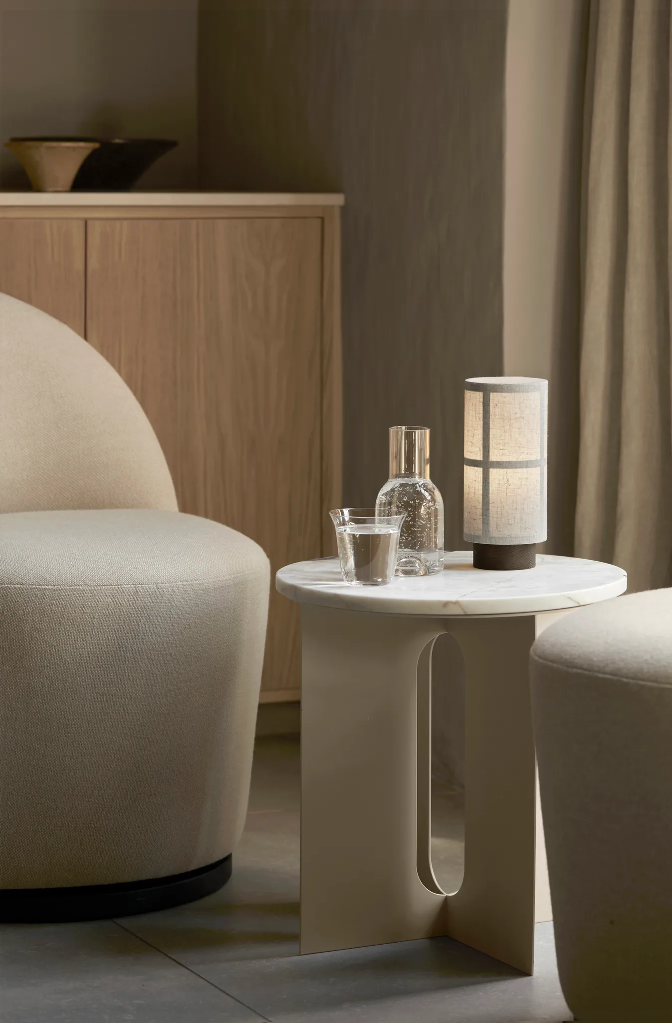 Hashira bordslampa portabel från Audo Copenhagen är en elegant och bärbar lampa formgiven av Norm Architects. Skärmen i linnetyg har en vacker form som påminner om japanska papperslyktor och en grafisk struktur på insidan som framträder effektfullt när lampan är tänd. Den portabla designen gör den lätt att flytta mellan vardagsrum, sovrum och läshörnan — perfekt för stämningsfull belysning där du behöver den. En tidlös detalj som skapar värme och balans i hemmet.
