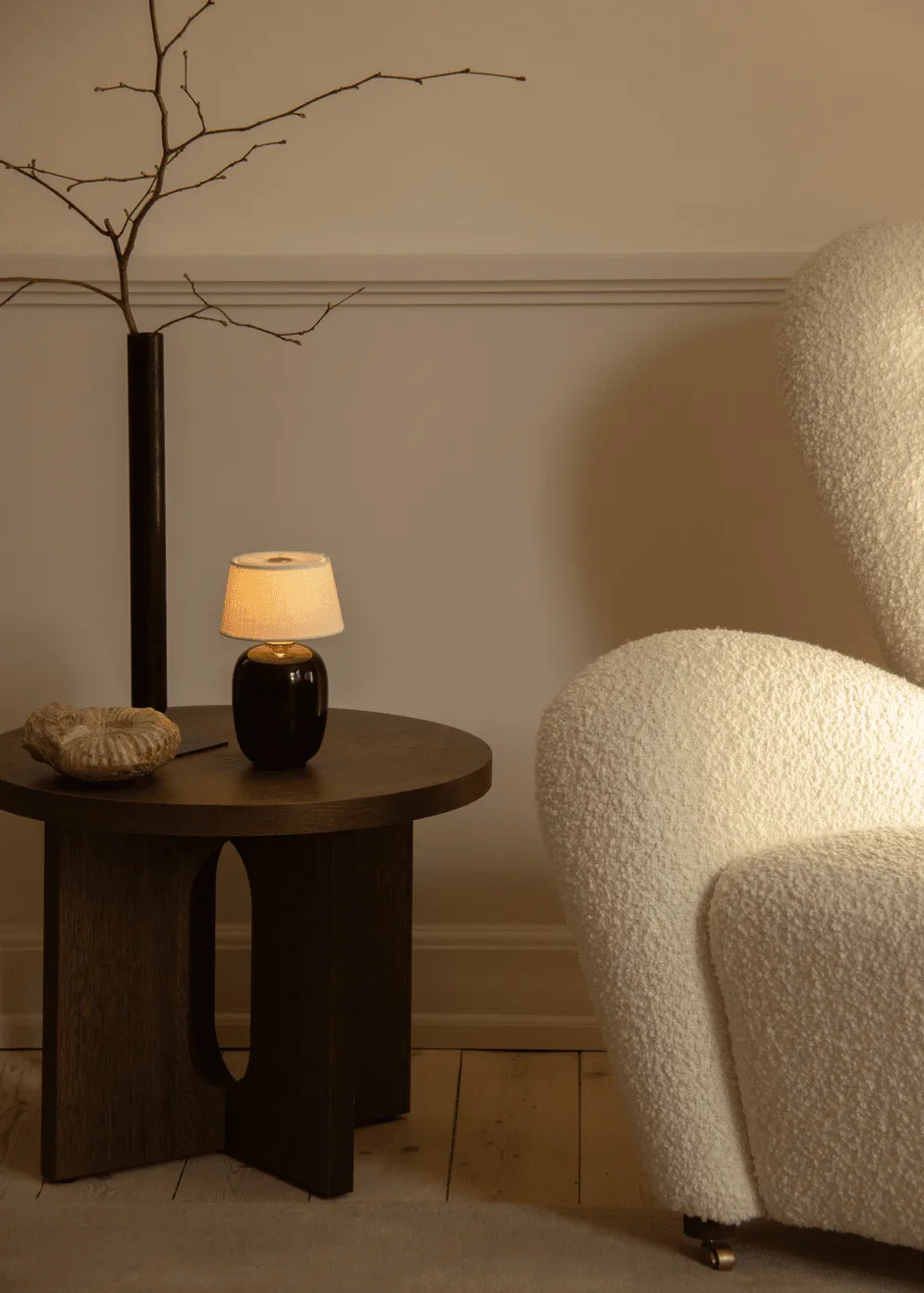 Torso bordslampa portable från danska Audo Copenhagen är designad av Kroeyer-Saetter-Lassen och är den lilla och portabla lampan av den större versionen Torso-bordslampan. Lampfoten är tillverkad i oglaserat stengods och har en mjuk rund form vilket kontrasterar snyggt mot den handgjorda lampskärmens raka linjer i skirt linne. Till dessa enkla och vackra material finner du mässingdetaljer på lampfoten och på toppen av lampskärmen. Mässingscylindern på toppen fungerar som en touch-dimmer vilket låter dig dimra lampan i tre steg genom att lätt vidröra den. Den portabla bordslampan är mycket lättplacerad och kan enkelt tas med till nästa rum tack vare dess storlek och att den är sladdlös.