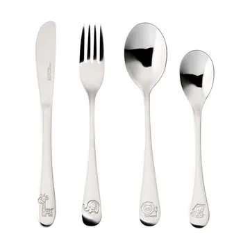 Eternum barnbestick är ett charmigt bestickset i rostfritt stål som gör varje måltid roligare för barn. Lekfulla djurmotiv pryder kniv 17,6 cm, gaffel 17 cm, matsked 16 cm och tesked 14 cm. Ytan är högblank och slitstark i 18/0 stål som tål flitig användning. Formen ger ett stabilt men lätt grepp för små händer och uppmuntrar självständigt ätande. En hållbar present som kombinerar funktion, säkerhet och glädje vid matbordet. Passar vardag och helg och blir snabbt en favorit i köket.