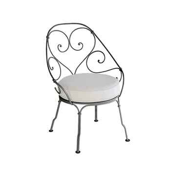 1900 Cabriolet karmstol från Fermob är en elegant utestol med inspiration från sekelskiftets franska trädgårdar. Den handsmidda stålramen med sina sirligt snirklade linjer skapar ett romantiskt uttryck, samtidigt som konstruktionen är robust och anpassad för dagens utomhusmiljöer. Den runda sitsen med avtagbar dyna erbjuder bekväm sittkomfort och gör stolen inbjudande för långa stunder i solen. Ytan är skyddad med Fermobs avancerade lackeringsteknik som motverkar rost och UV-blekning, vilket ger en möbel som håller formen och färgen år efter år. 1900 Cabriolet karmstol från Fermob kombinerar klassisk fransk elegans med modern hållbarhet och kan med fördel matchas med borden i samma serie för en harmonisk uteplats.