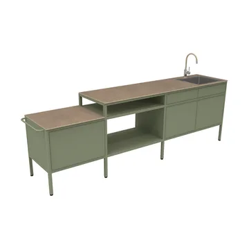 Goosto The Generous utekök med diskho från Fermob är ett rymligt och genomtänkt utekök som förvandlar matlagning utomhus till en njutning. Den eleganta aluminiumkonstruktionen är hållbar året runt och tål väder och vind, samtidigt som designen känns ren och modern utan synliga skruvar. Den gedigna bänkskivan i HPL och den rostfria diskhon gör det enkelt att förbereda och servera mat, medan smidiga lådor och förvaringsutrymmen håller ordning på köksredskapen. Med justerbara ben och möjlighet att koppla till både vattenledning eller trädgårdsslang är uteköket både flexibelt och praktiskt. Ett stilfullt och funktionellt tillskott till hemmet som inspirerar till samvaro och utomhusmatlagning.