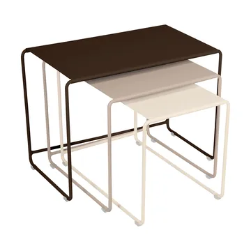 Oulala satsbord från Fermob är ett kompakt set med tre metallbord i olika storlekar som går att anpassa efter behov. Använd Oulala som ett litet sidobord för kaffekoppen eller dra ut alla borden och få ett långt avlastningsbord med plats för både bok, solhatt och drink.