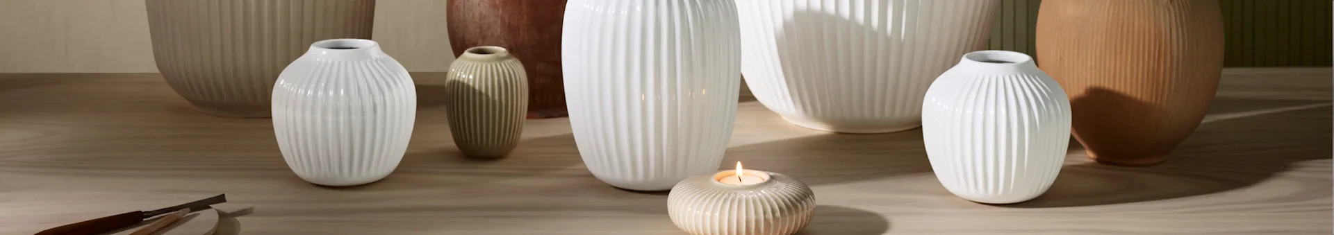 Förutom de mycket uppskattade och välkända vaserna, hittar du också handtillverkade serviser i högkvalitativ keramik, men också eleganta tallrikar i glas i serien Hammershøis. Gemensamt är att alla produkter har de karaktäristiska fårorna som kännetecknar den populära serien från Kähler.