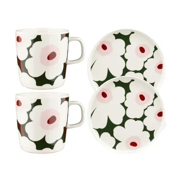 Unikko frukostset från Marimekko är designat av Sami Ruotsalainen och innehåller två rymliga muggar och två tallrikar i stengods. Detta tåliga set levereras i en elegant förpackning med Marimekko-logotypmönster. Perfekt för att förgylla frukoststunden med stil och funktionalitet.
