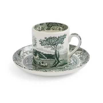 Heritage Green Italian kopp med fat från Spode är en elegant frukostduo i klassiskt porslin med det ikoniska landskapsmotivet i djupgrönt. Den tidlösa designen skapar en inbjudande servering och blir lika fin på frukostbrickan som på helgens brunch. Koppen passar för kaffe, te eller varm choklad, medan fatet ger ett harmoniskt helhetsintryck och fångar eventuellt spill. En uppskattad del av Heritage Green Italian som förenar samlarvärde, tradition och funktion i hemmets vardag.